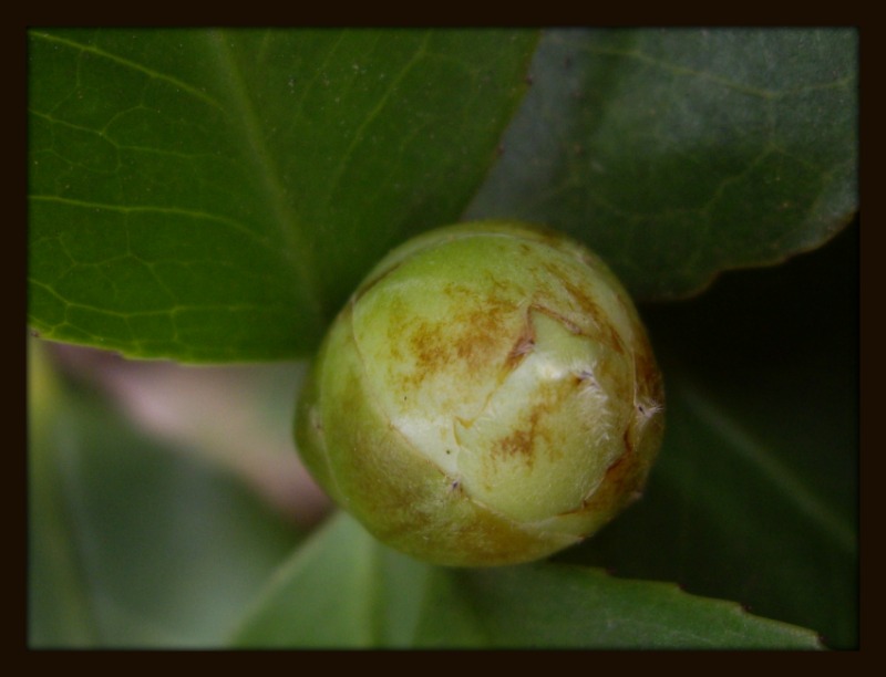 This is a Rhododendron bud. The green is leaves, not flower parts, unlike the Camellia. When this Rhododendron blooms, in each of these leaf sections will be a flower. It's amazing to see something so large and beautiful come from such a complex bud.